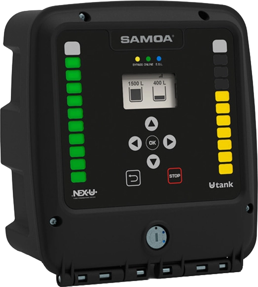 Tank level monitor module to control two tanks. When mounted in a NEX.U.® system it keeps real time inventory and increases operation safety preventing air entering into pumps when the tank is empty and overflow during clean oil delivery and in waste oil storage tanks. It can also be used to control the general air supply to the pumps. U.tank has two independent graphic displays and level bars, each of them shows the inventory available in each tank. It also has a set-up keypad for inventory adjustement if required(1). The number of input and output ports are: